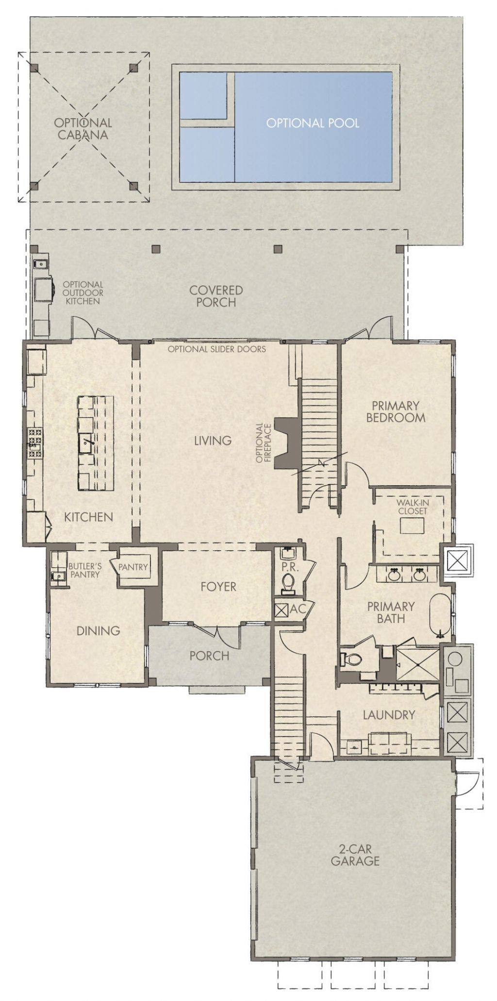 Currently in framing! April progress photos coming next week.The Darien III by Romair is a custom residence with a detached carriage house, offering 4,775 square feet, 5 bedrooms, 5 bathrooms, 2 half baths, and a 2-car garage, located on a Homesite backing up to vast dry pond area in Powell Landing East at Watersound Origins.The first level is arranged with clearly defined spaces, beginning with a dedicated dining room that includes a built-in wet bar and undercounter wine refrigeration. The kitchen is positioned at the rear of the home, opening directly to the covered porch and summer kitchen, creating a direct connection to the outdoor...read more