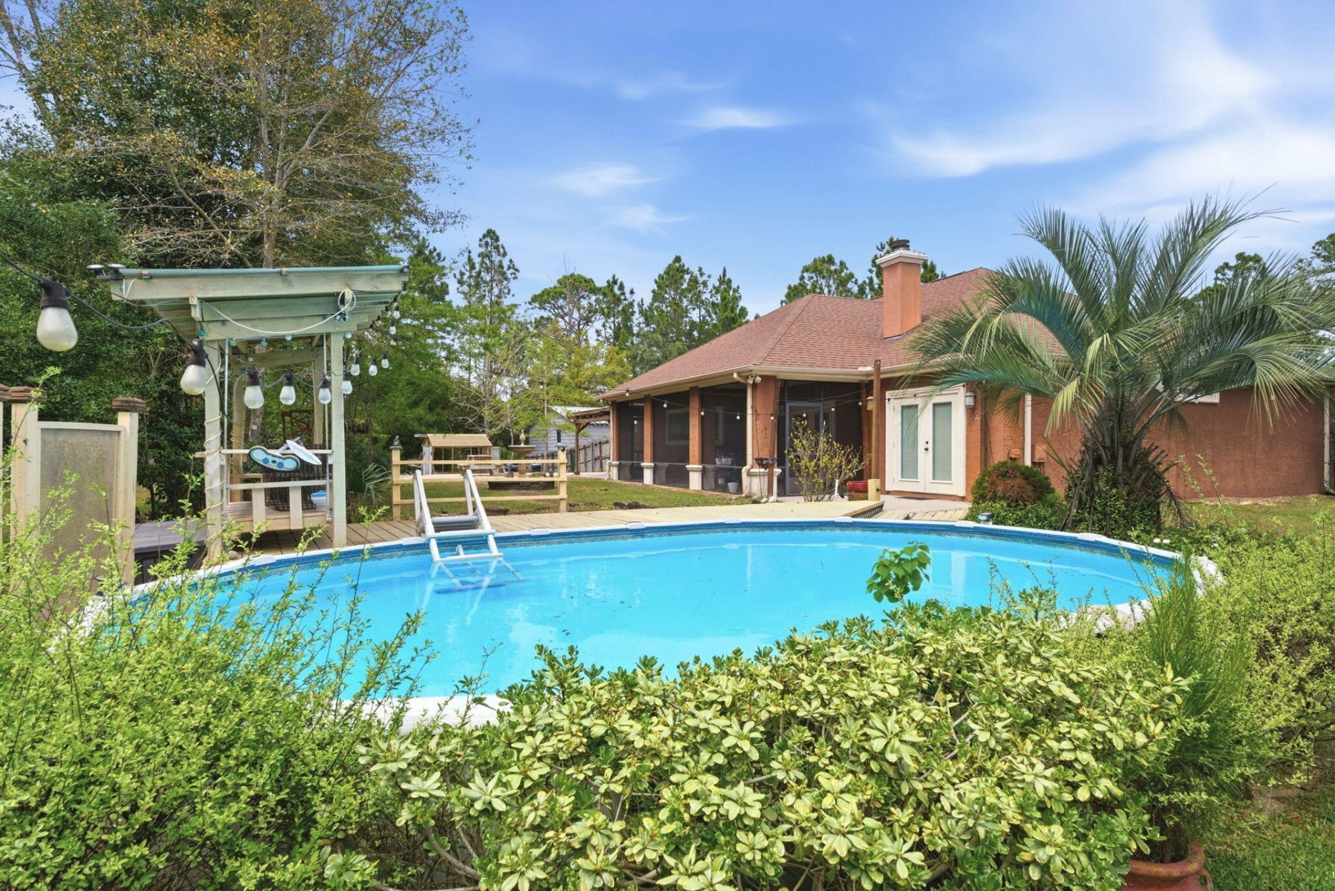 Welcome to this stunning, custom-designed retreat of a home - perfectly situated on 1.27 acres in the Whispering Pines community of Navarre. This 2,216-SqFt home offers a split floor plan with an open concept Main living space with accented wood beamed ceilings and pillars and beautiful, semi-polished travertine stone flooring that flows seamlessly throughout - ensuring a carpet-free, low-maintenance living experience. The heart of the home is a chef's dream kitchen, featuring a massive 3x10 granite island with breakfast bar, stainless steel appliances - including a gas powered stove - a farmhouse sink, and updated cabinetry. The dining room...read more